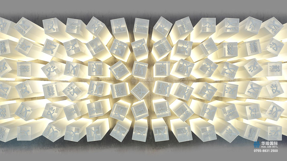 漢中是國內(nèi)唯一一個(gè)以”漢”字為開頭的城市,也是漢人老家、漢文化的發(fā)源地之一,在中國歷史上有著不可忽視的地位,在漢文化中有著極為重要 的歷史價(jià)值。”漢“字對(duì)于中國、對(duì)于漢文化、對(duì)于漢中都有著極其特殊的意義,因此,在這里將”漢“字提煉為吊頂元素,以一百八十種不同寫法的“漢”字制作為仿印章的造型燈,排布于天花之上,猶如海浪起伏變換,使參觀者感受”漢人老家“的磅礴氣韻。